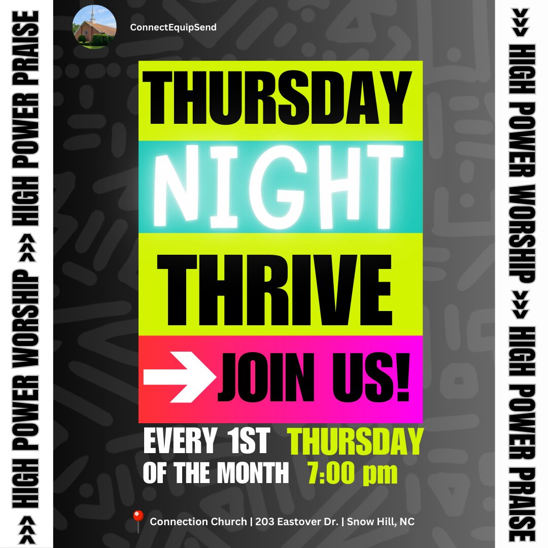 Experience high power praise, annointed worship, & powerful preaching at THURSDAY THRIVE! Every 1st Thursday of the month at 7pm. All ages are welcome.