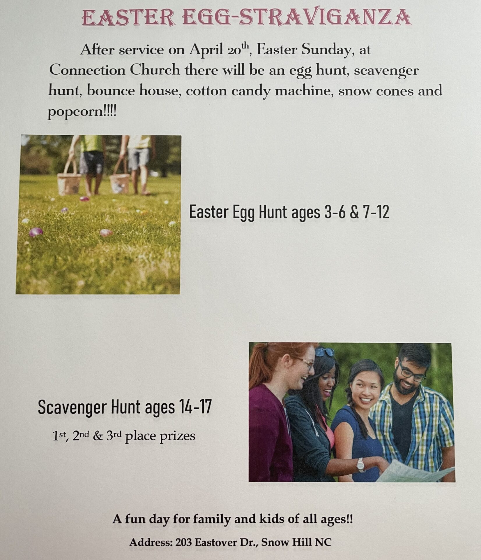 ![]() Easter EGG-STRAVIGANZA begins after 10:30 am service. There will be an egg hunt, scavenger hunt, bounce house, cotton candy machine, snow cones and popcorn!! Easter Egg Hunt is for ages 3-6 & 7-12 Scavenger Hunt is for ages 14-17. 1st, 2nd, $ 3rd prizes. A fun day for family and kids of all ages!! ![]() Connection Church @ Snow Hill is a full gospel body of believers. We are a member church of the North Carolina Conference of the International Pentecostal Holiness Church. Our goal is to connect with people in an effort to connect them to a closer relationship with God. We believe that we were created to worship […] |
